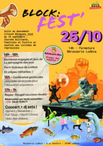 1ère édition du BLOK’FEST, journée de soutien aux manifestants du mouvement « Indignons nous, bloquons tout » qui aura lieu à la brasserie Lodéva et au CLAP de Lodève la journée et soirée du samedi 25 octobre de 14h à 00h. Au programme conférences, éduc pop, animations familiales et concerts!