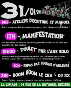 Le but : S’ambiancer joyeusement contre le projet de Centre de Rétention Administrative à Béziers (le 09 janvier la Préfecture a pris un arrêté pour faire modifier le Plan Local D’Urbanisme pour rendre le terrain constructible à ce triste projet).