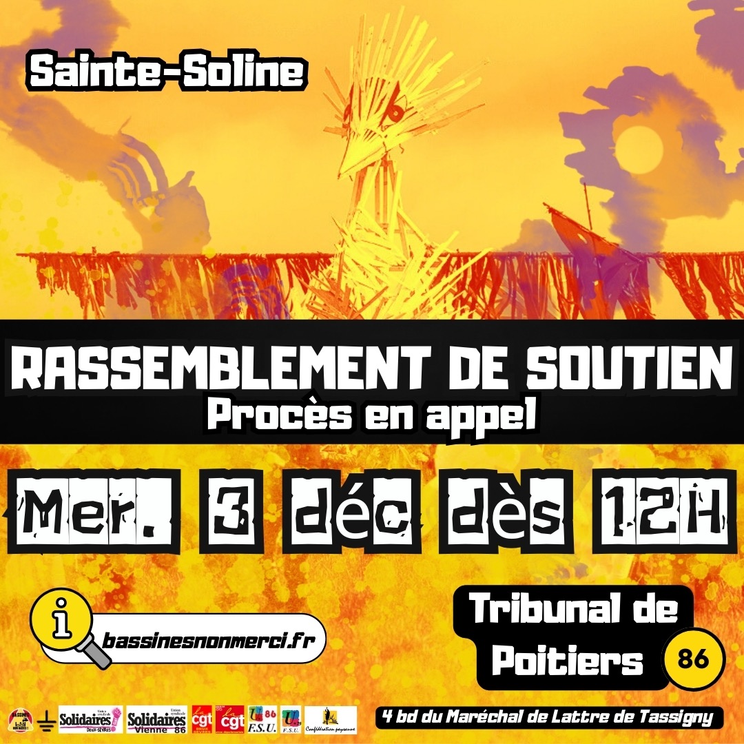 Pour rappel, presque deux ans après la décision scandaleuse du tribunal de Niort, 4 des 9 camarades condamnés pour leur engagement contre les méga-bassines passeront en appel le 3 décembre à Poitiers.