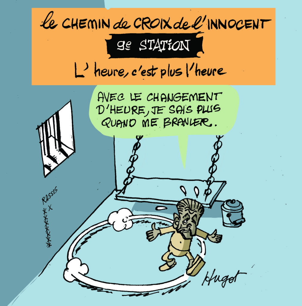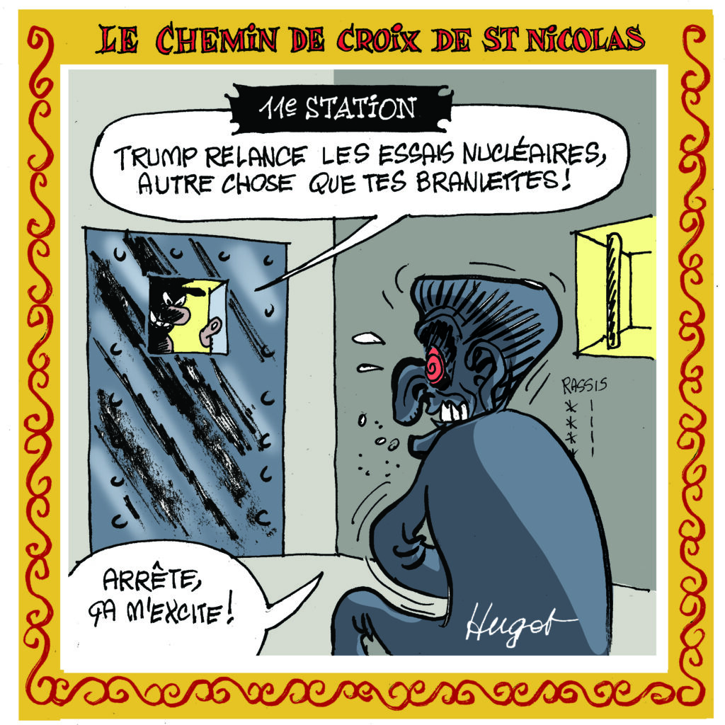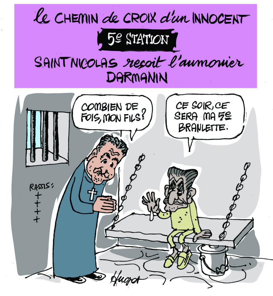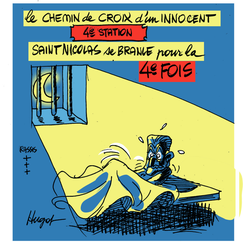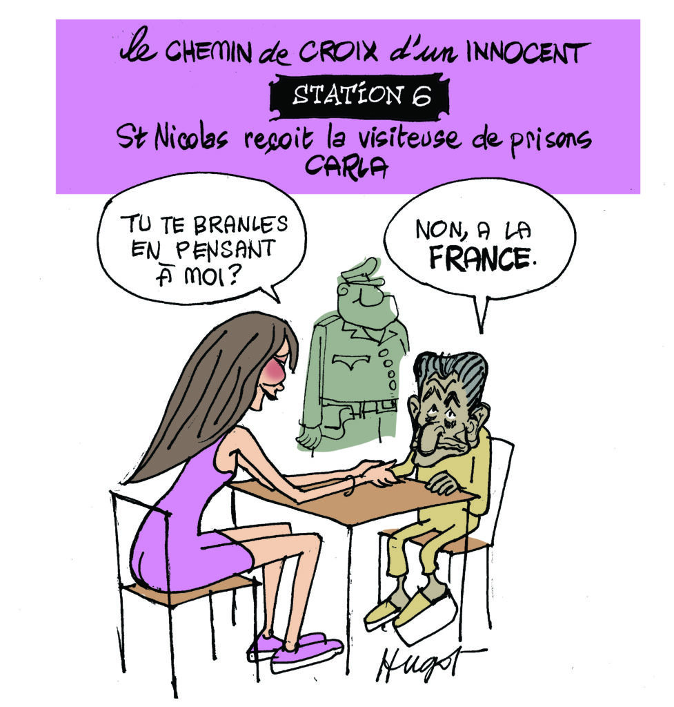 Hugot qui, comme chaque automne relit les Evangiles, une hygiène de vie puisée à Hara Kiri, a bien évidemment été frappé par l’écho qui résonne entre la vie de Jésus et celle de Saint Nicolas. Bien sûr l’iconographie a changé mais l’esprit, l’âme devrait-on dire, est toujours là. Nicolas pardonne-leur ils ne savent pas ce qu’ils font.ugot nous fait le plaisir de publier sur notre site des dessins d’actualité avec, en ce moment, une série qui a pour personnage principal l’horrible Sarkozy en prison.